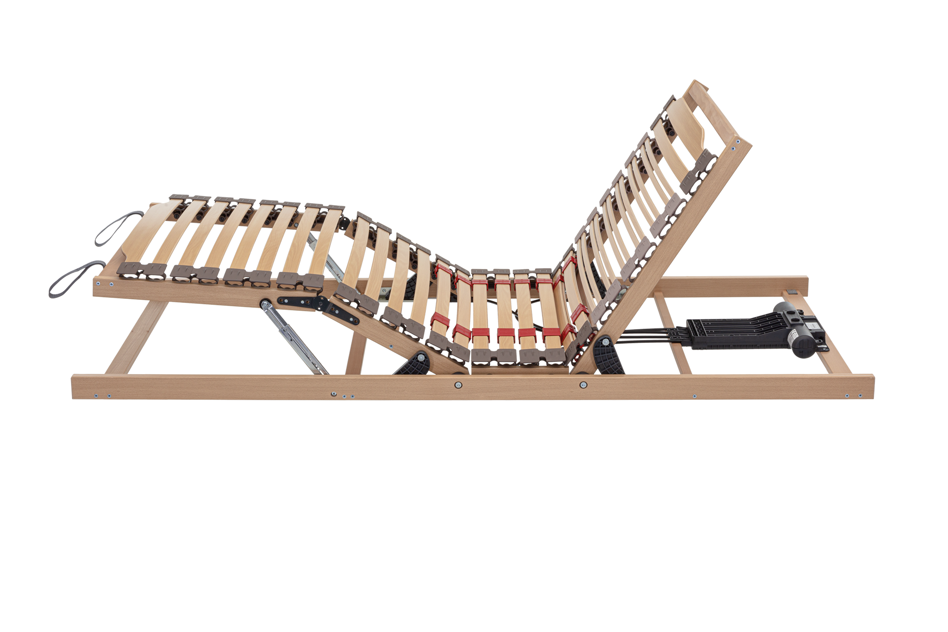 ✓ Ultraflache Bauweise: Nur ca. 10 cm hoch – ideal für Betten mit Schubauszügen oder Bettkasten. ✓ Integrierte Motoren: Im Fußbereich verbaut, für eine platzsparende und gleichmäßige Verstellung. Gleichmäßiger Antrieb über beidseitigen Seilzug. ✓ Ergonomische Schulterzone: Extra weiche Kappen mit vier mechanischen Absenkungen für optimale Druckentlastung. ✓ Stabile Metallstreben: Verstärken den Rahmen und sorgen für Langlebigkeit und Sicherheit. ✓ Flexible Steuerung: Wahlweise mit Kabel oder Funk – passend zu individuellen Vorlieben. ✓ Reflux-Option: Modell mit motorischer Refluxverstellung für bessere Atmung und Entlastung bei Beschwerden. Funk-Variante ohne Memory-Funktion. AUSSENRAHMEN: • Buchenschichtholz in Buchedekor, folienummantelt • sehr stabil und verzugsfrei • 60 mm hoch, 25 mm stark FEDERHOLZLEISTEN AUS BUCHENHOLZ • 20 Federschichtholzleisten in Buchedekor, 38 mm breit • 2 Federschichtholz-Abschlussleisten in Buchedekor, 68 mm breit • Schulterkomfortzone: 12 schmale Federschichtholzleisten mit 4 mechanischen Schulterabsenkungen • Lordosezone: 1 Doppelleistenpaar mit 4 arretierbaren MZV-Schiebern zur Härteregulierung und 2 mechanischen Höhenverstellern • Lendenwirbelstütze durch rote Federwegsbegrenzer • Mittel-/Beckenzone: 3 Doppelleistenpaare mit 12 arretierbaren MZV-Schiebern zur Härteregulierung KAPPEN • 28 überstehende Kappen aus langlebigem Hightech-Material MASSE: Rahmenhöhe ca. 10,0 cm HINWEIS FÜR MOT-AUSFÜHRUNGEN: Alle Motorrahmen sind grundsätzlich ausgestattet mit Netzfreischaltung und Notabsenkung.