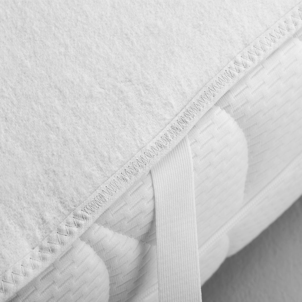 Premium-Matratzenauflage, Qualität 159 • sanforisiert, reinweiß, 100% Baumwolle, • ca. 470 g/m² • Kette: 18 Fd./cm - 34/2-fach Nm • Schuss: 22 Fd./cm - 7 Nm • Auflage mit Bandeinfassung und Eckgummis. • Einfassband 6 cm • Farbe: weiß