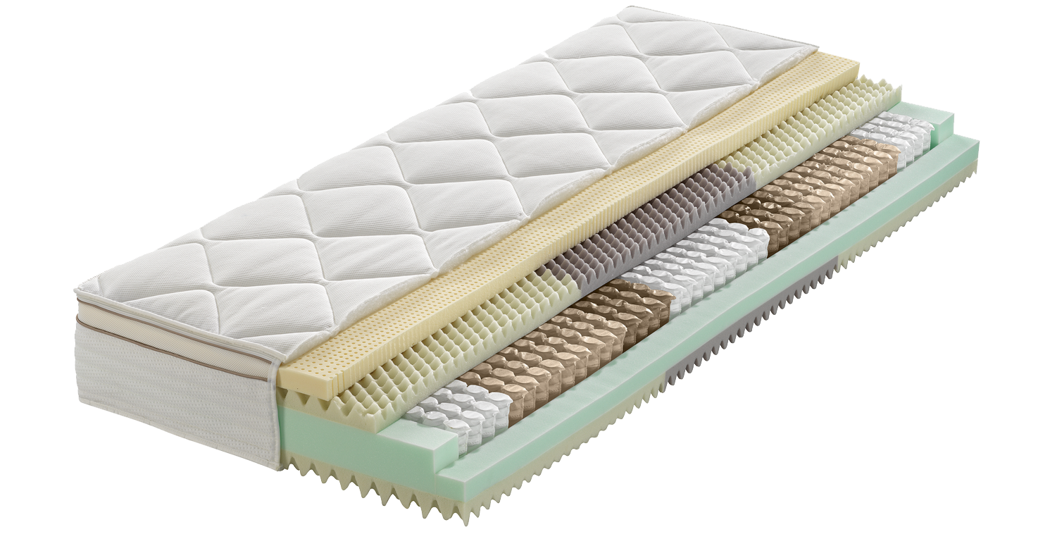 KERN: Tonnentaschenfederkern (1000 Federn/2m²) mit beidseitigen Kaltschaumauflagen RG 55, Liegefläche hochelastische Talalay-Latex-Auflage entlastet die Wirbelsäule und sorgt für ideales Klima-Verhalten, einseitiger Liegekomfort KERNHÖHE 22 cm • zonierter Tonnentaschenfederkern mit unterschiedlichen Federkräften abgestimmt auf die Körperzonen Schulter, Lordose u. Becken • zonierte Kaltschaumauflagen mit spezieller Noppenoberflächen-Auflösung für spannungsfreien Liegekomfort speziell im Schulterbereich und optimalen Luftaustausch BEZUG: Borderbezug Oberseite: 60% Polyester, 40% Tencel®-Lyocell, versteppt mit 380 g/m² Hygienevlies (100% Polyester), umlaufendes Klimaband, abnehmbar, 4-seitiger Reißverschluss, waschbar bis 60 °C Bezugsstoff mit 37° DMM-Technologie: 37° Dual-Moisture-Management-Technologie reguliert selbstständig den Feuchtigkeitstransport zur und von der Hautoberfläche und somit den Feuchtigkeitshaushalt und die Körpertemperatur. So wird Ihr Hitze- oder Kälteempfinden automatisch ausgeglichen und das Schlafklima gerät wieder in Balance. Unterseite: 100% Polyester, Versteppt mit 100 g/m² Hygienevlies (100% Polyester) GESAMTHÖHE: Ca. 25 cm