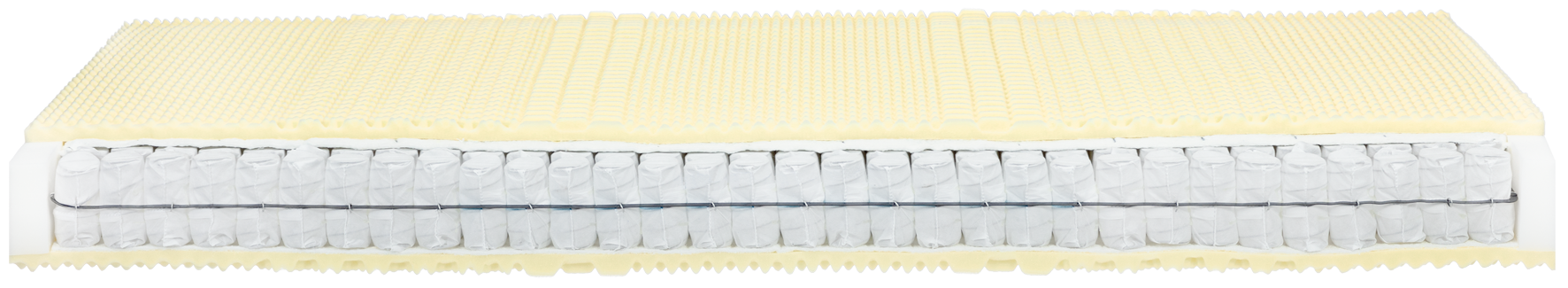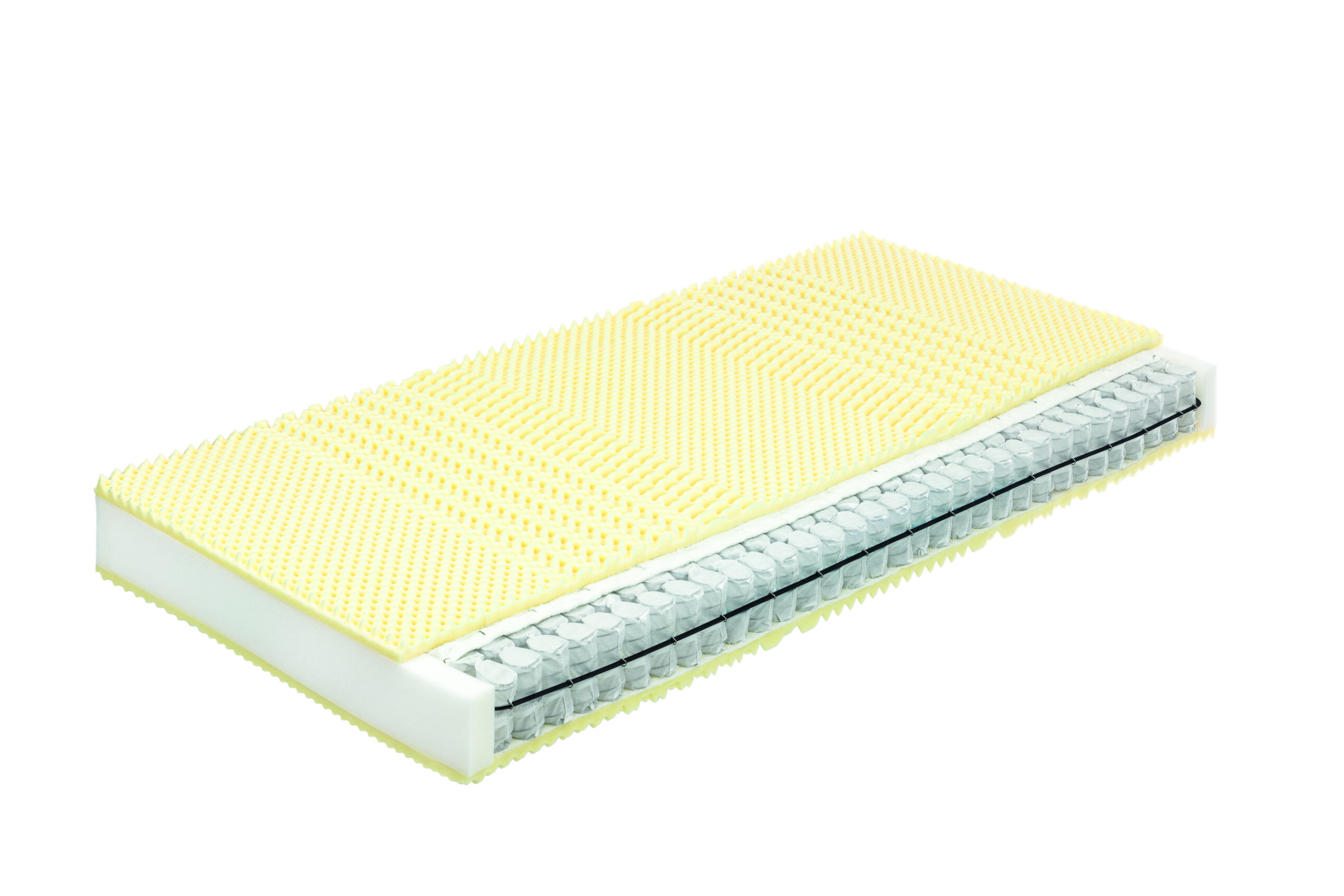 Kern: • 12 cm hoher 7-Zonen-Tonnentaschenfederkern mit 440 Federn • Kernhöhe ca. 18 cm • Wollfilz-Federkernabdeckung • beidseitig ca. 3 cm hoher AQUAPUR®-Schaum mit ergonomischer Noppenoberfläche, RG45 • Trikot Zwischenbezug Bezug: • Royal Dream-Jersey, Dessin 3780 TKZ 58 % Polyester, 42 % Lyocell (Tencel) • versteppt mit 400 g/m² Hygienevlies (100% Polyester) • rundum, Wendeschlaufen • abnehmbar durch Reißverschluss • waschbar bis 60 °C Gesamthöhe/Seitenhöhe: Ca. 21 cm Besondere Merkmale: zertifiziert nach OEKO-TEX® Standard 100, Produktklasse 1 für Babyartikel, Lizenznummer 63489