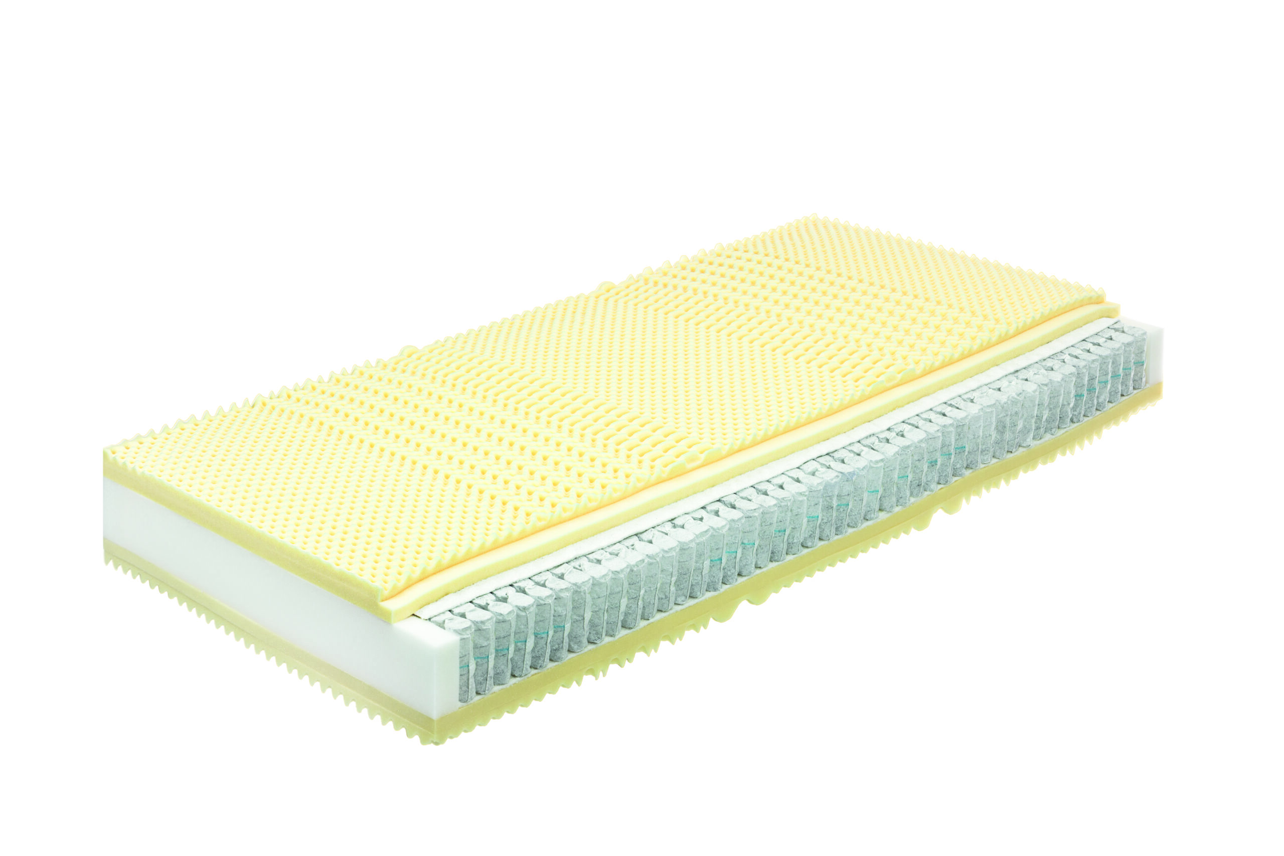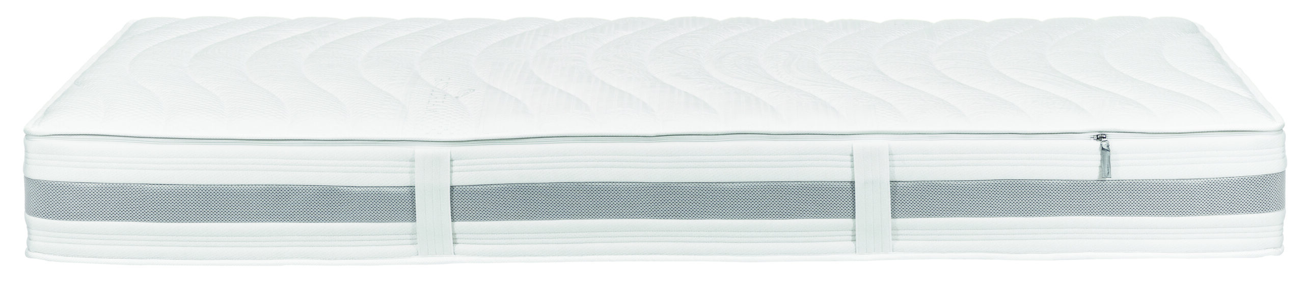 Kern: • 12 cm hoher 7-Zonen-Tonnentaschenfederkern mit ca. 1000 Federn • Kernhöhe ca. 23 cm • beidseitig ca. 5,5 cm hohe Sandwich-Polsterauflage aus AQUAPUR®-Schaum, Raumgewicht 50 kg/m³ • ergonomische Waffelprofilierung auf der Oberfläche • Trikot Zwischenbezug Ziergesteppter ROYAL DREAM Lyocell-Jerseybezug Lyocell-Jersey, 60% Polyester, 40% Tencel®-Lyocell, versteppt mit 400 g/m² Hygienevlies (100% Polyester) • Borderbezug mit silbernem Klimaband aus weitmaschigem Mesh und Handgriffen, • abnehmbar durch Reißverschluss • Jerseybezug waschbar bis 60 °C Gesamthöhe/Seitenhöhe: Ca. 26 cm Besondere Merkmale: zertifiziert nach OEKO-TEX® Standard 100, Produktklasse 1 für Babyartikel, Lizenznummer 63489