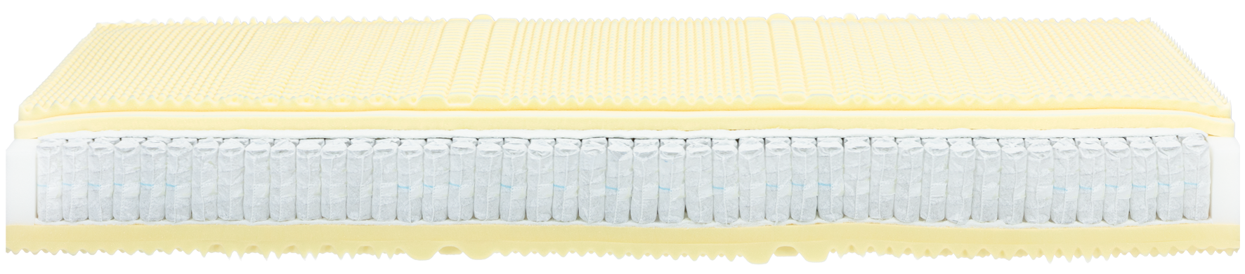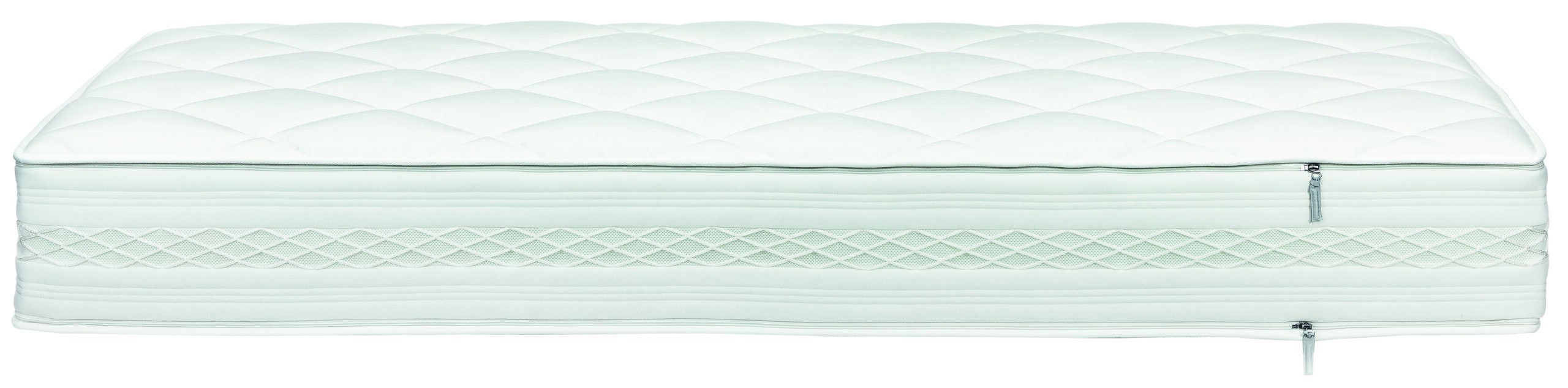 KERN: • 12 cm hoher 7-Zonen-Tonnentaschenfederkern mit ca. 1000 Federn • Kernhöhe ca. 22 cm • Wollfilz-Federkernabdeckung • beidseitig ca. 5,5 cm hohe Sandwich-Polsterauflage aus AQUAPUR®-Schaum, Raumgewicht 55 kg/m³ • ergonomische Waffelprofilierung auf der Oberfläche • seitliche Sitzkantenverstärkung • Trikot Zwischenbezug BEZUG: Borderbezug mit Griffnetz kombiniert mit einem Klimaband aus weitmaschigem Mesh, abnehmbar durch 2 Reißverschlüsse ✓ Lyocell-Jersey mit Hygieneausstattung, Dessin 3200 70 % Polyester, 30 % Lyocell, versteppt mit 600 g/m² Hygienevlies (100% Polyester), waschbar bis 60 °C GESAMTHÖHE: ca. 26 cm BESONDERE MERKMALE: zertifiziert nach OEKO-TEX® Standard 100 Für verstellbare Lattenroste geeignet